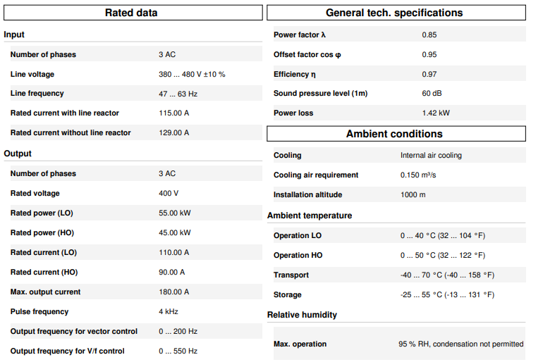 Módulo de potencia SINAMICS G120 PM240 sin filtrar con chopper de frenado integrado 380-480 V 3 CA +10/-10% 47-63 Hz sobrecarga alta: 45 kW al 200% 3 s, 150% 57 s, 100% 240 s temperatura ambiente -10 a +50 °C sobrecarga baja: 55 kW al 150% 3 s, 110% 57 s, 100% 240 s temperatura ambiente -10 a +40 °C 634 x 350 x 316 (alto x ancho x profundidad), FSF grado de protección IP20 sin unidad de control ni BOP